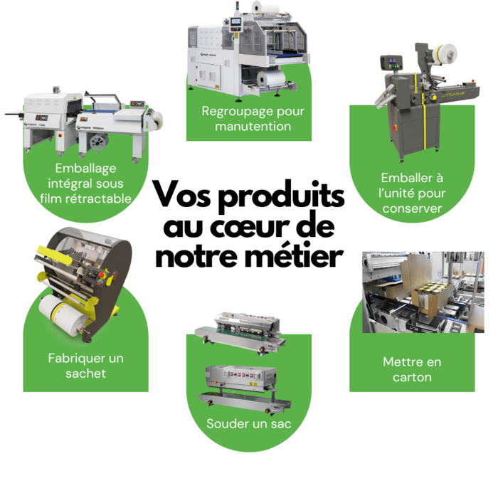 Avec une vaste sélection de machines d'emballage : soudeuses à emballage intégral, des fardeleuses, des ensacheuses flow pack... Nous répondons à tous les besoins en emballage sous film rétractable.